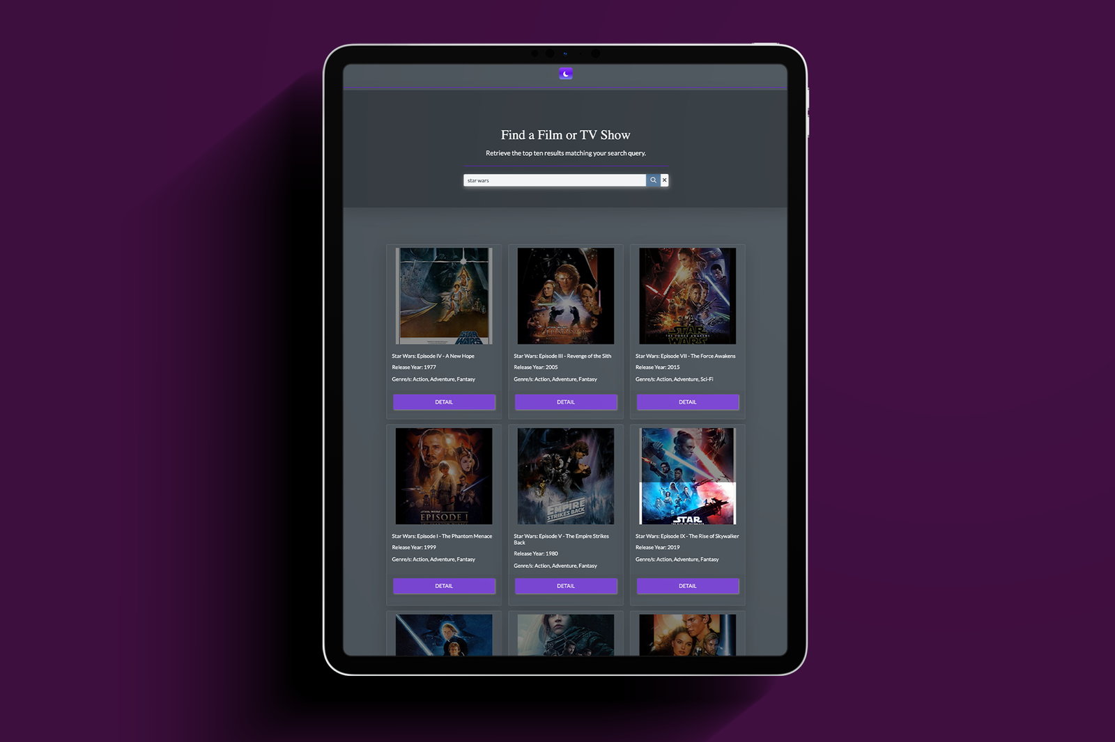 Using an API called OMDB API(Open Movie Database), a RESTful web service to retrieve movie or series information, I built a small app to display movie or series information. I used JavaScript, Jquery, Bootstrap, and CSS. Dark and light mode is incorporated to provide greater personalization.